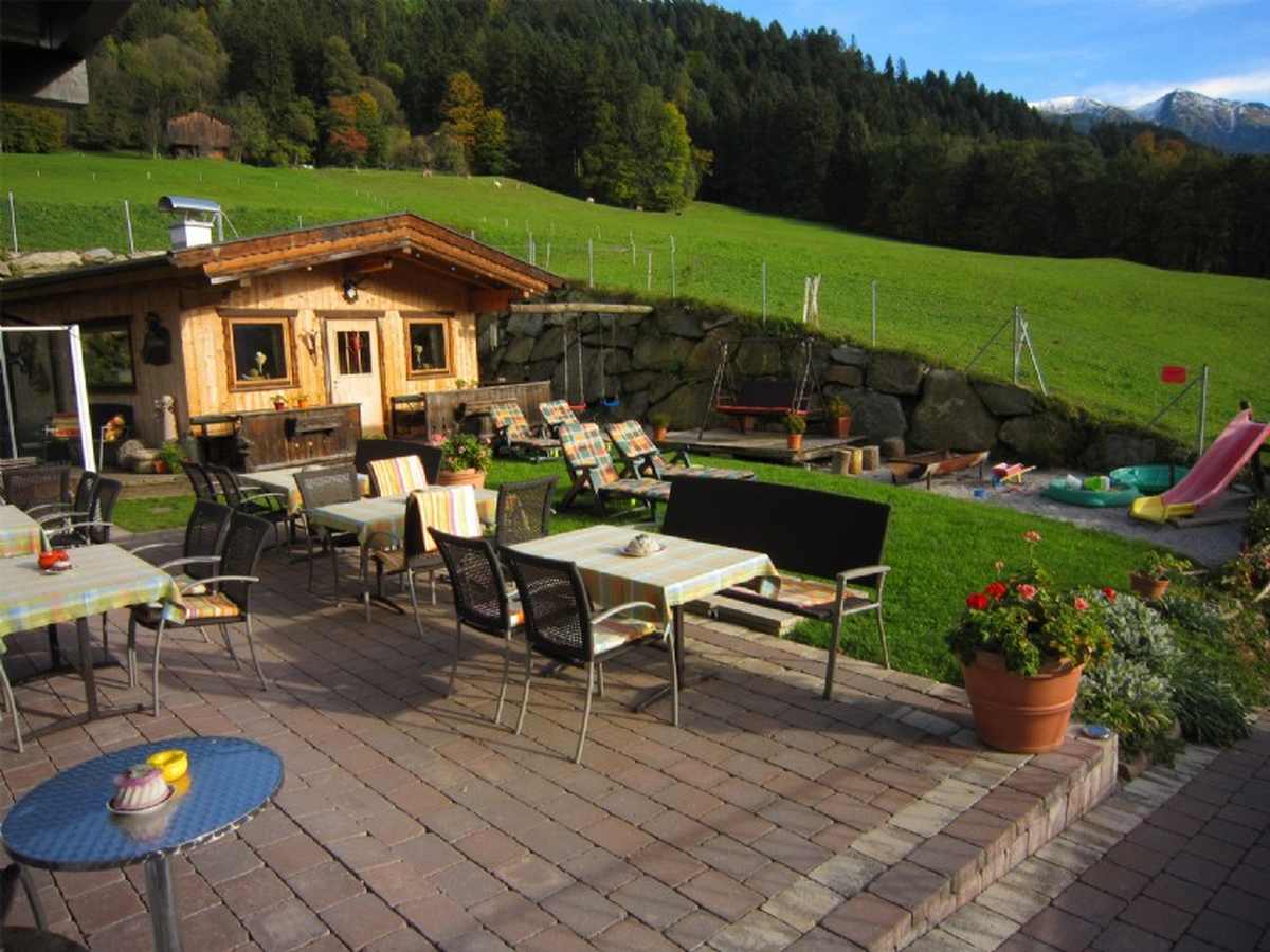 Ein sonniger Gastgarten mit Almhütte