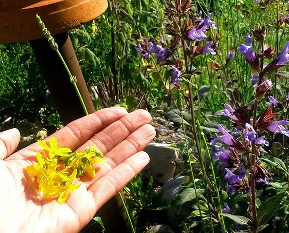 Unzählige Kräuter werden bei uns zu Heilsalben, Ölen und Salzen verarbeitet. Unter anderem stellen wir hauseigenes Johanniskrautöl, Ringelblumensalbe oder verschiedene Kräutersalze her. Die selbstangebauten Kräuter aus unserem Garten finden sich nicht nur als Dekoration im Haus, auf den Tischen und Tellern wieder, sondern auch unsere Speisen werden damit verfeinert.